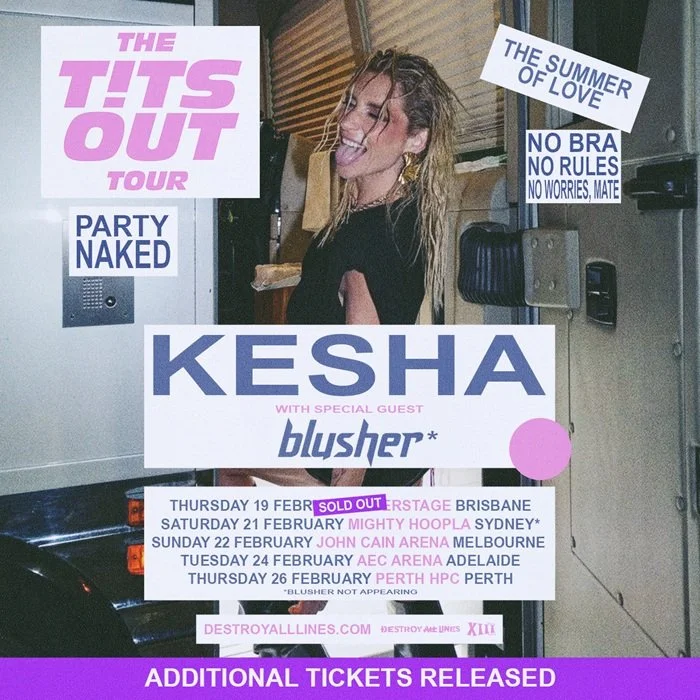 Multi-Platinum global pop superstar Kesha will continue the monumental success of her biggest headline run of her extraordinary career with the eagerly awaited Australian leg of The Tits Out Tour – her first headline tour Down Under in over a decade. The tour, which follows a sold-out “House of Kesha” headline show in Sydney and a headline set at the Australian Open’s AO Live event in Melbourne earlier this year, will see Kesha hitting 4 major cities across Australia in February 2026
